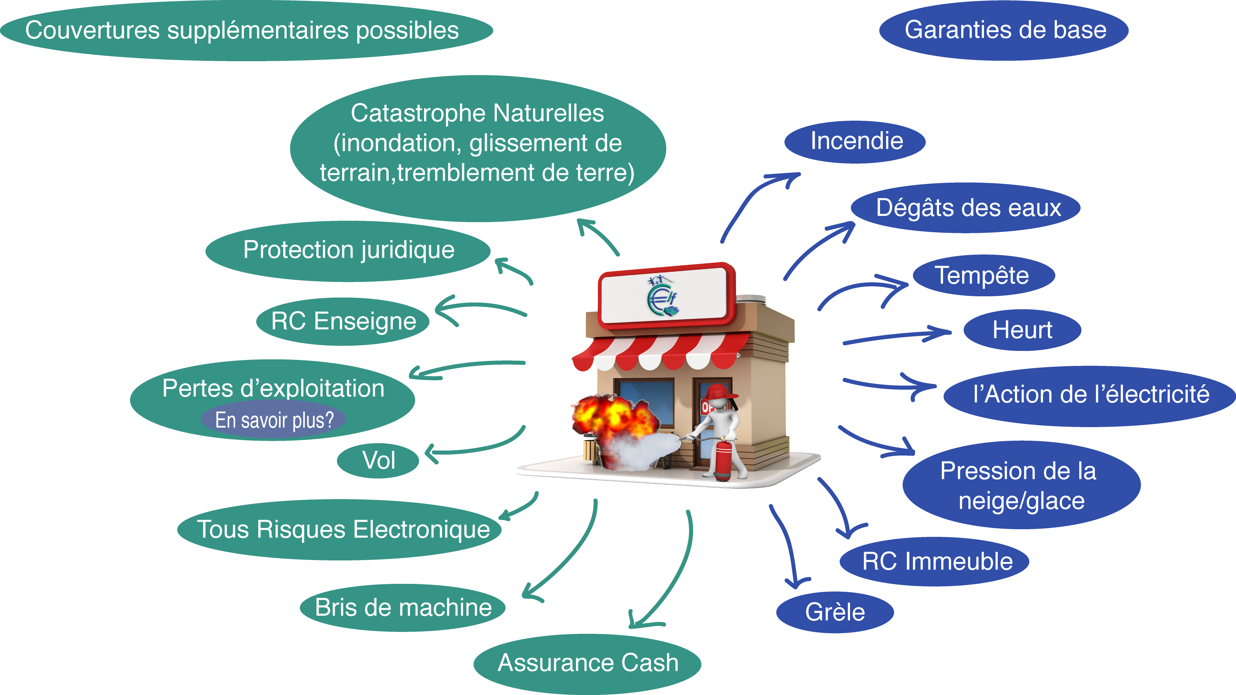 Votre assurance Incendie commerce peut comporter un volet d’assurance pour le bâtiment à usage professionnel (propriétaire ou locataire) et/ou un volet pour le contenu. Votre couverture ne se limite pas à cela. Elle peut également comporter une couverture vol, pertes d’exploitation, assurance du cash, …